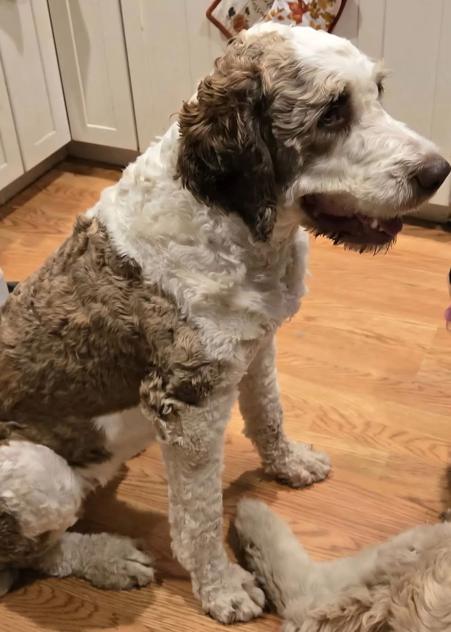 Pippi is one of my Saint Berdoodles and a nicer, calmer more loving dog you could not find. She loves all the puppies, children and people who come thru the door. Pippi is always taking care of all the wee babes. Pippi has excellent eye contact was a breeze to train. She is off leash trained. If on a leash she does not pull and makes sure to keep you in site at all times. I cannot wait to see her puppies in 2025.