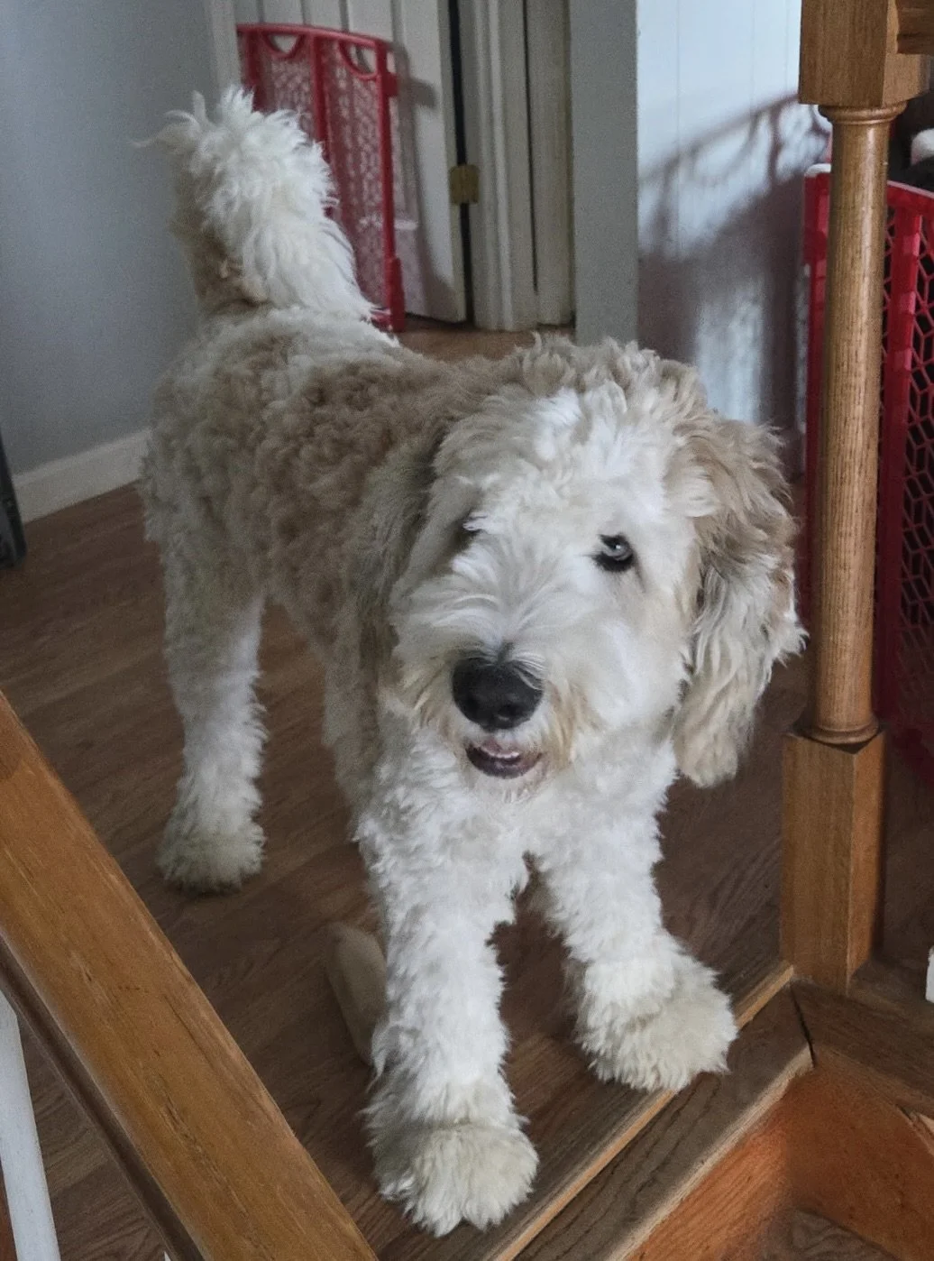 CONNOR is a Saint Berdoodle and is so soft and fluffy he is like a cloud just waiting to be snuggled. He is the most gentle old soul. Connor is ever so calm and gentle with a soulful look in his eye. He knows no stranger loves everyone and has excellent recall. He was very easy for his guardian home family to train.