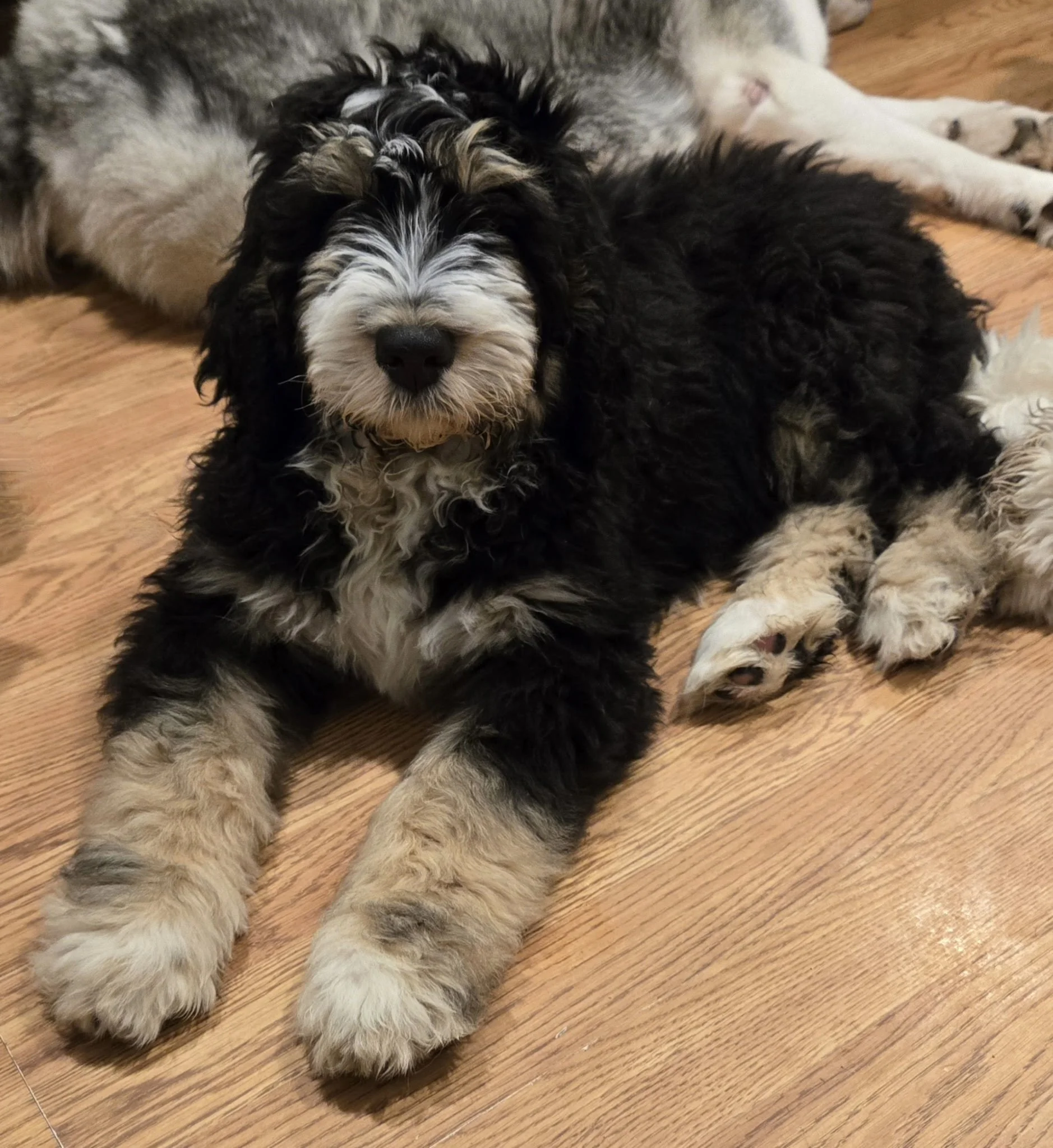 Maisy is one of our Bernedoodles and a nicer, calmer more loving dog you could not find. She loves all the puppies, children and people who come thru the door. Maisy’s guardian home has two young children who just adore her and raising her puppies. Maisy has excellent eye contact was a breeze to train. We anticipate her passing these down to her offspring.