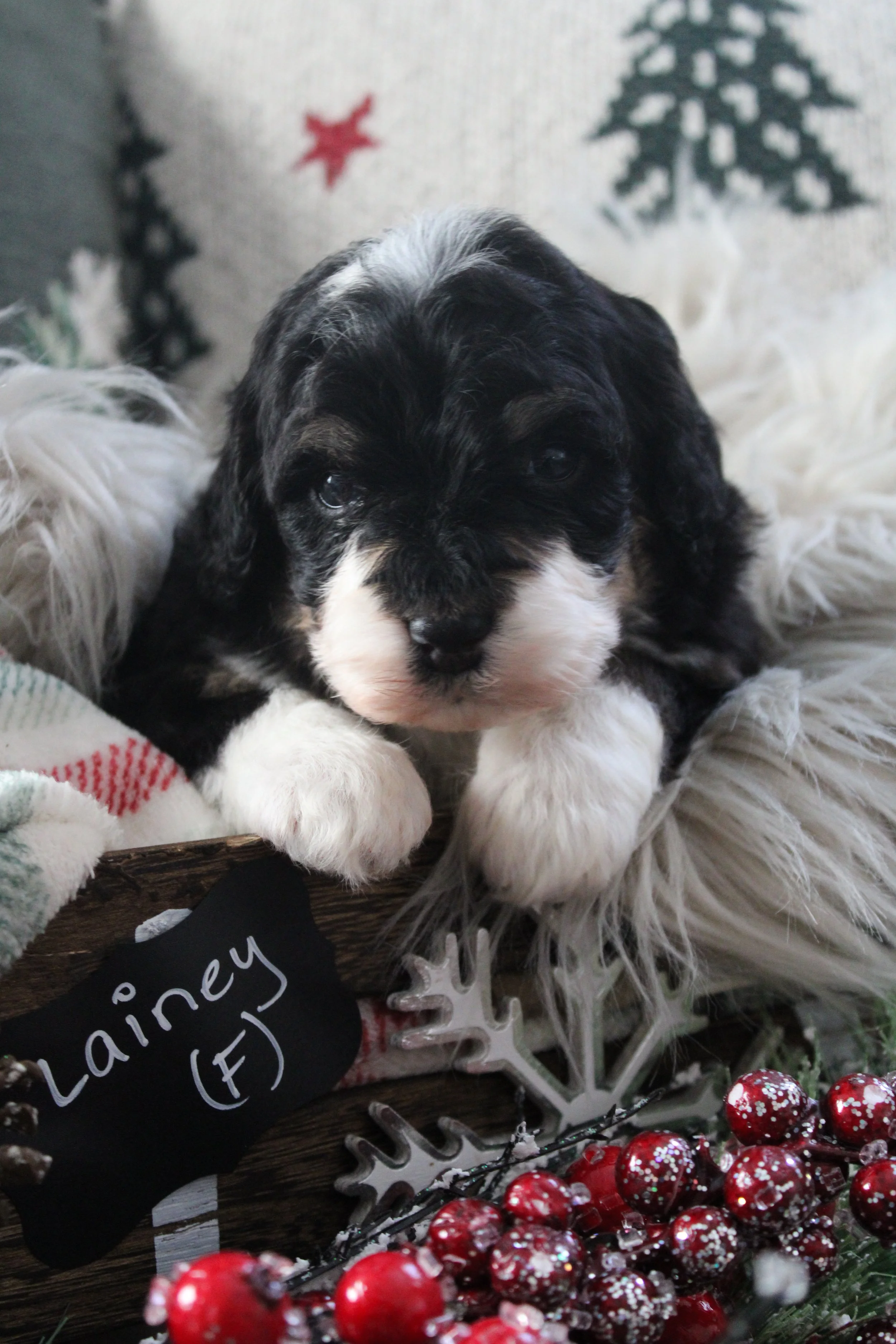 AVAILABLE Tessa’s Australian Bernedoodles LAINEY (F) estimated size at maturity 45-55lbs go home date 1/6/26. Free delivery if within 4 hours of Keene NH
